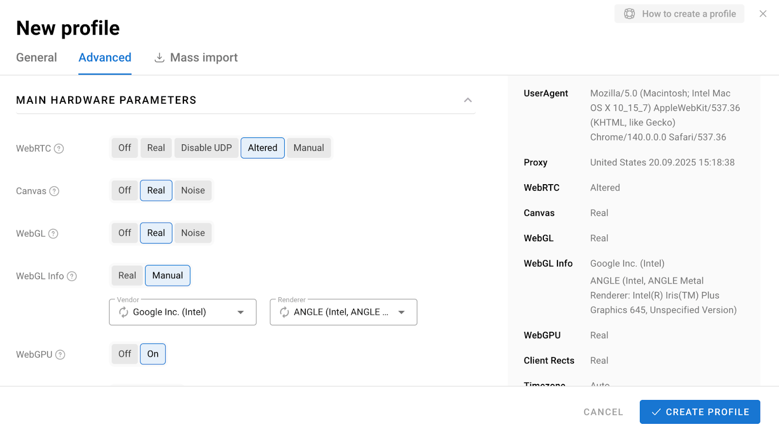 Dolphin Anty works on a much deeper level than simple spoofing. It completely randomizes a wide range of browser fingerprint parameters, creating the impression that each profile is a separate user with a unique device.