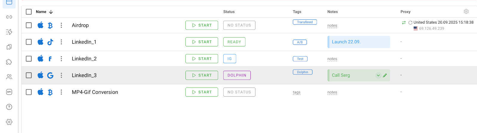The Dolphin Anty interface is designed to remain clear and convenient even when managing hundreds of profiles. You can organize them with tags, statuses and notes. These tools let you quickly find the accounts you need and structure your workspace.