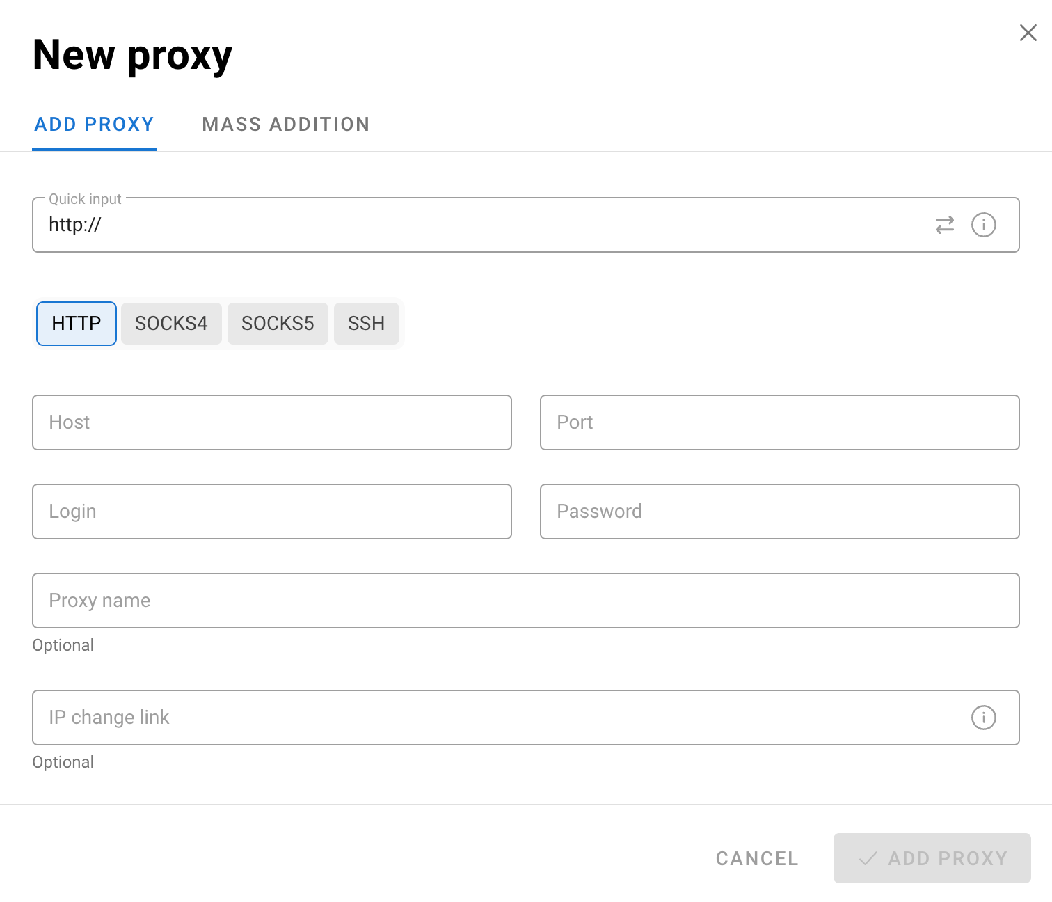 Step 4: Adding proxies to Dolphin Anty. To do this, go to the “Proxies” tab in the main menu and click “Add Proxy”. Enter the data in the “Quick Input” field and the corresponding fields will be automatically filled in.