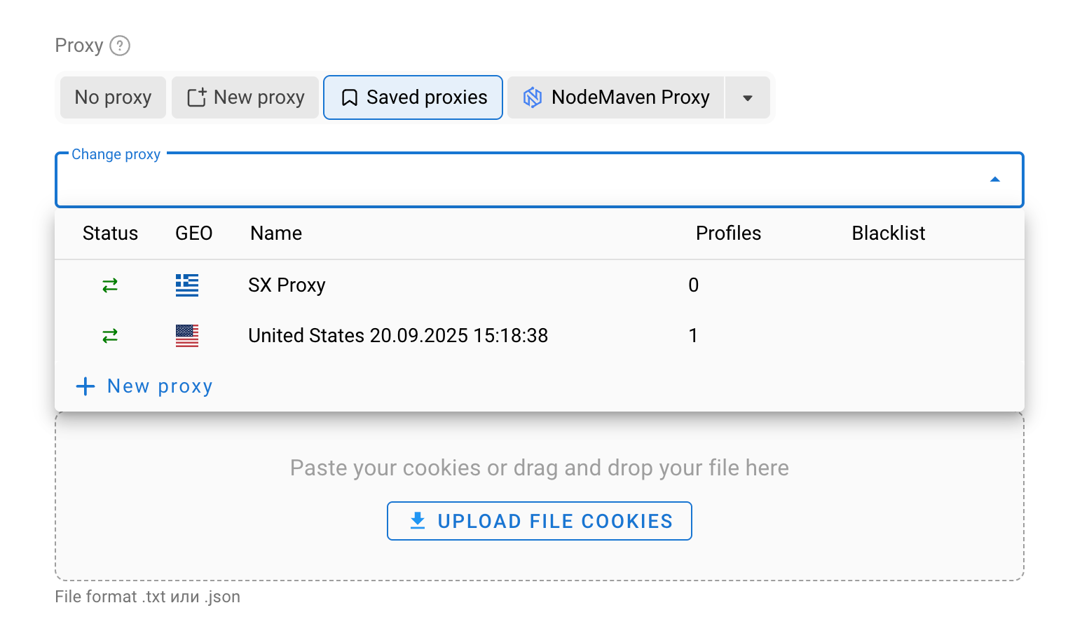 Proxy management is given top priority. You can handle them either while creating an account or in a dedicated menu tab. Here’s how it works using proxies from SX.ORG as an example.
