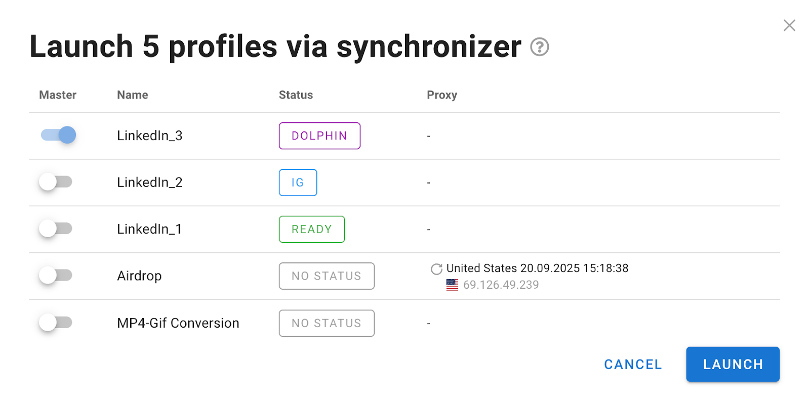 The synchronizer copies actions performed in the master profile and repeats them in real time on subsidiary ones. This is useful when you need to safely perform the same action across multiple accounts while preserving natural pauses and variations in movements.