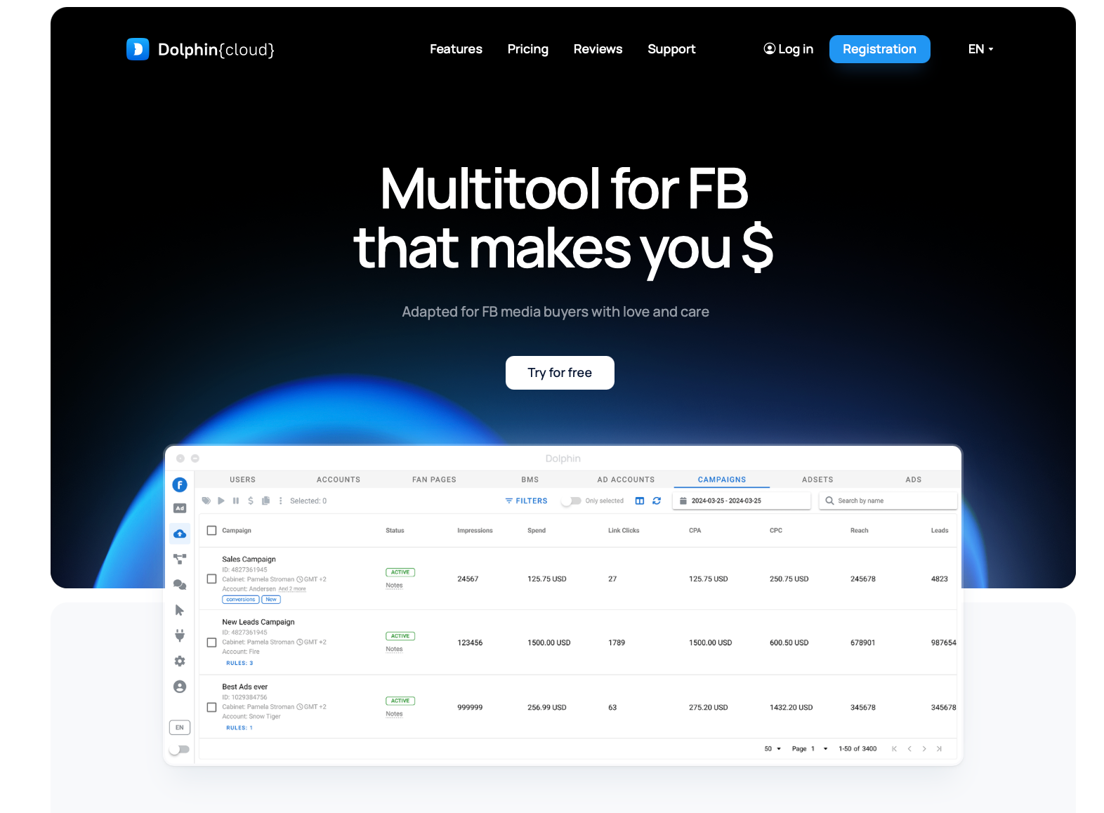 Dolphin Cloud is a separate solution for managing Facebook Ads campaigns. It allows you to automate budgets, targeting and campaign rules, assign team roles — admin, team lead, buyer or farmer — and monitor their performance in real time.