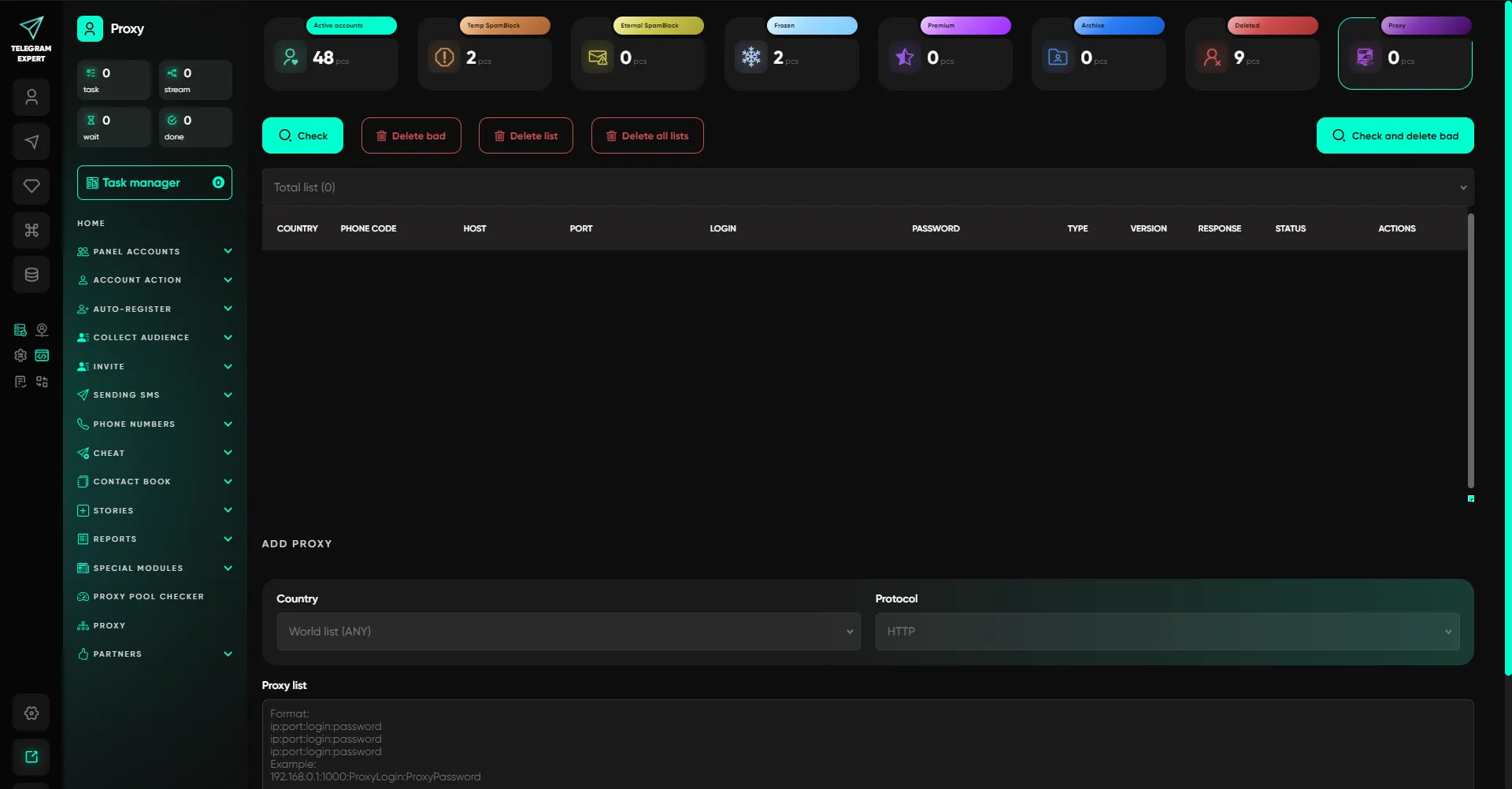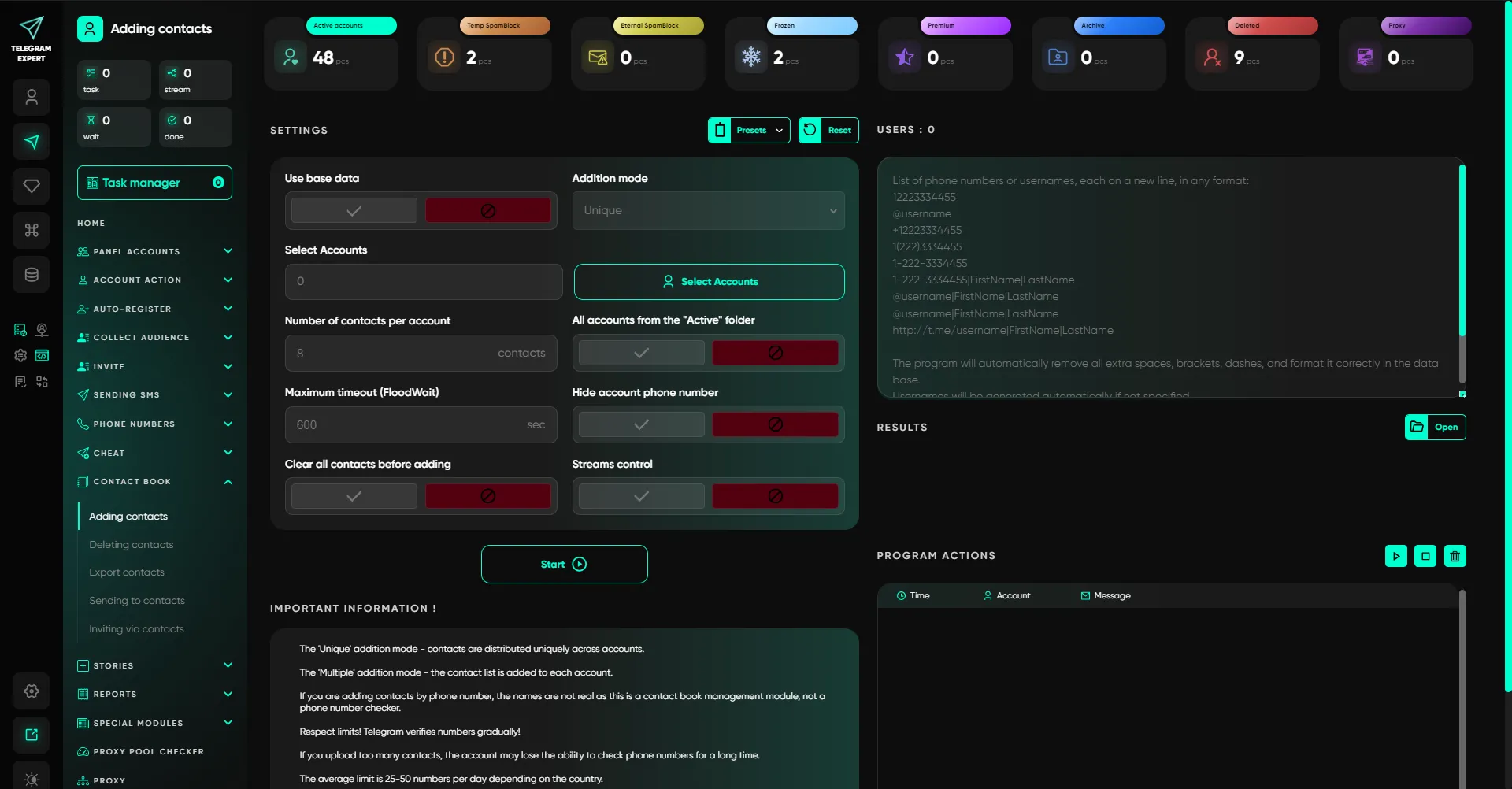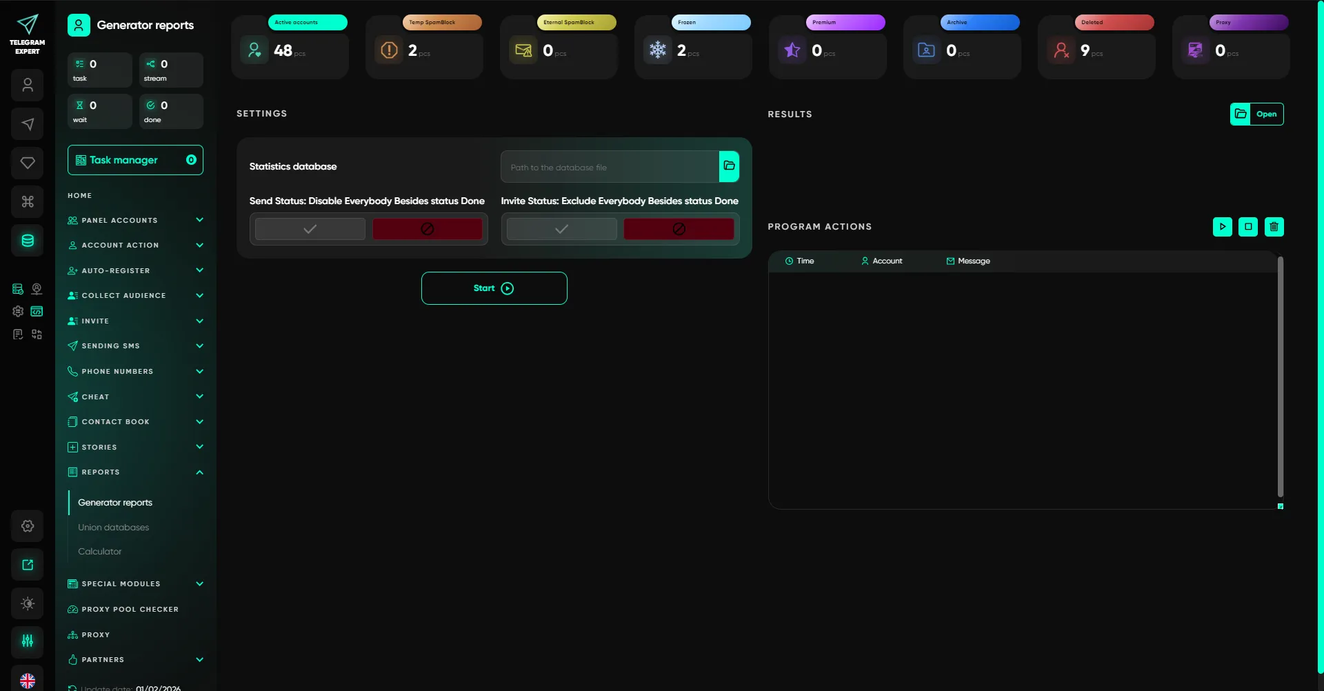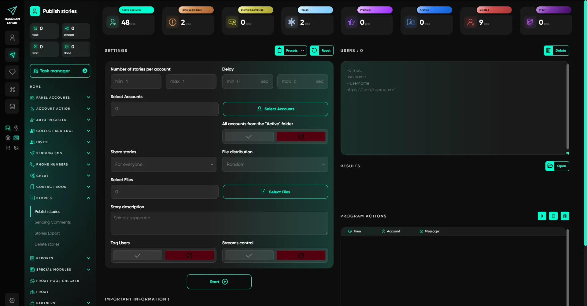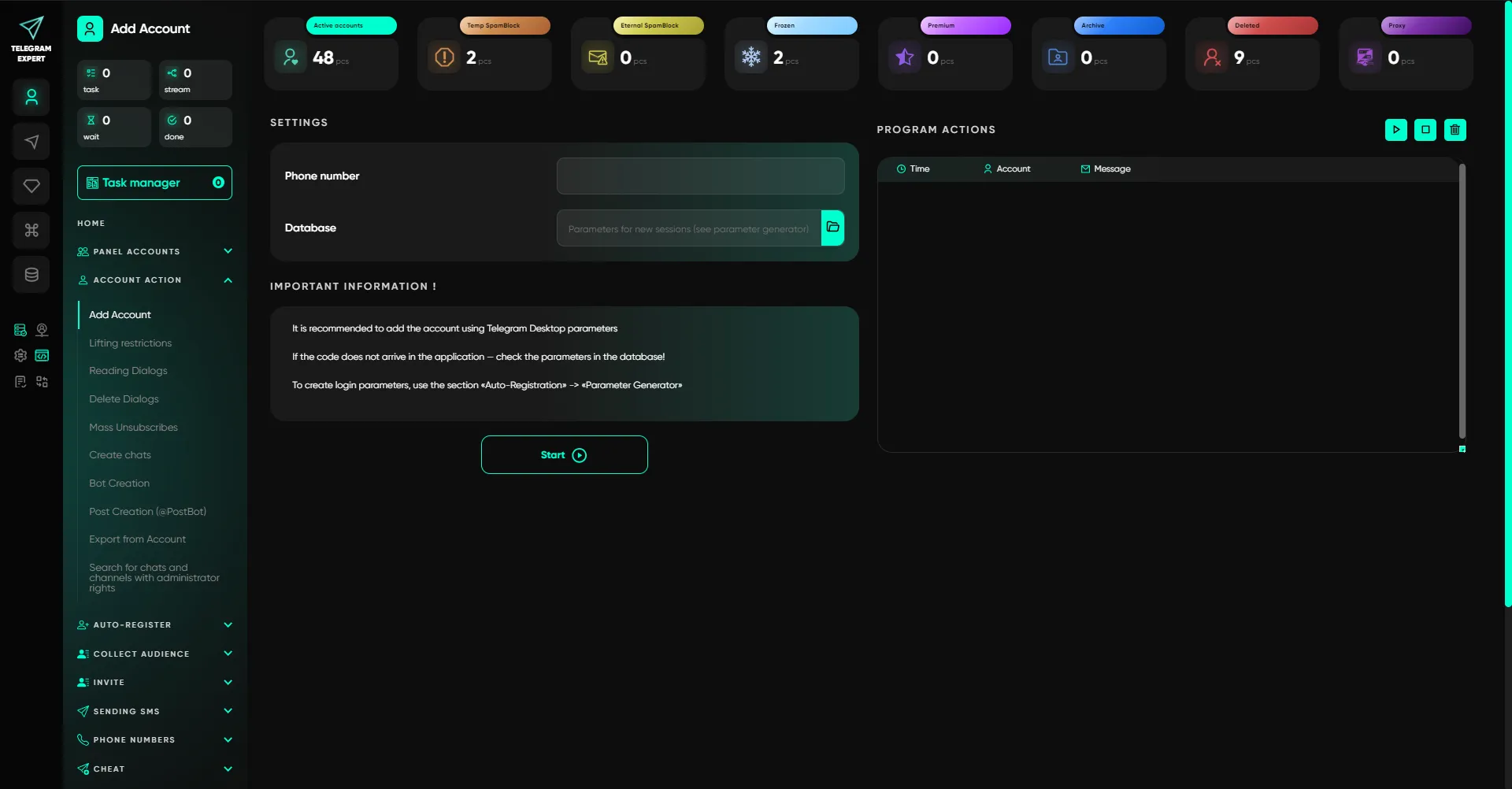 Telegram Expert to kompleksowa platforma do pracy z Telegramem na dużą skalę i w ujęciu profesjonalnym. Oprogramowanie łączy zarządzanie kontami, automatyzację działań, pozyskiwanie odbiorców i analitykę w jednym systemie, bez półśrodków i rozproszonych rozwiązań.