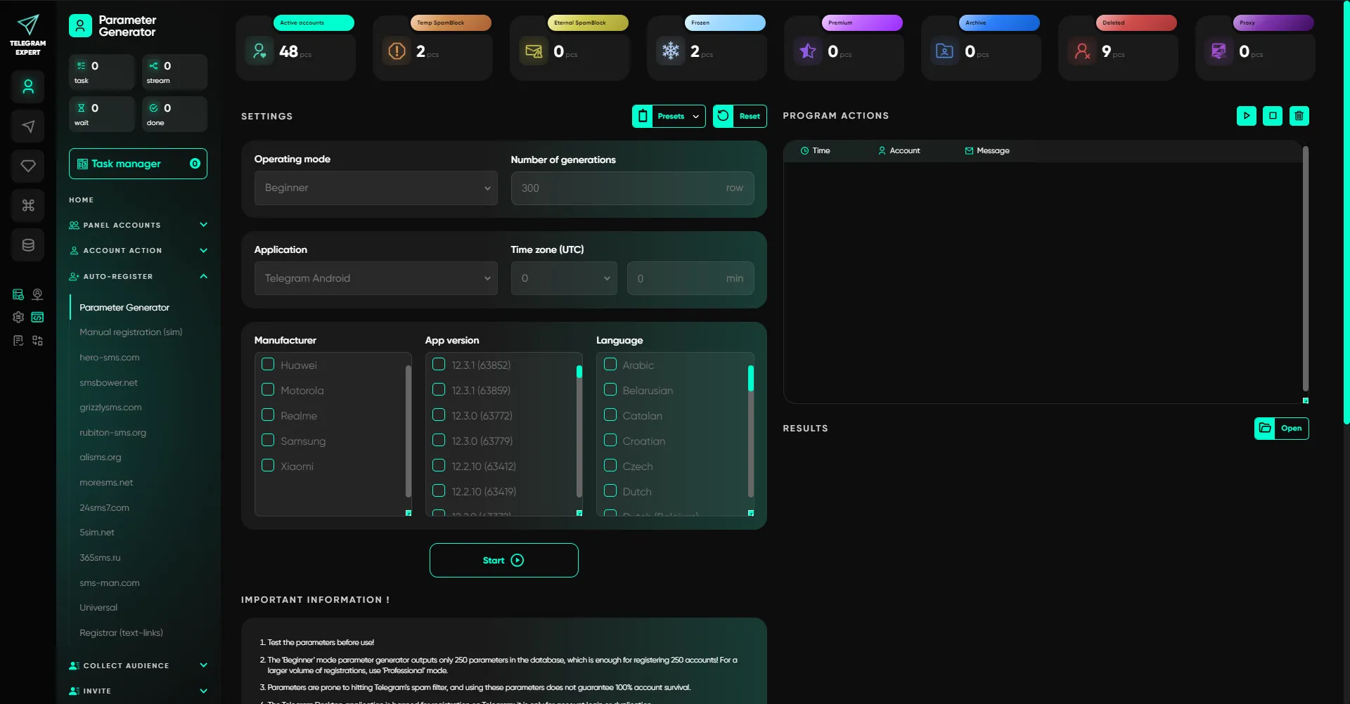 Narzędzia do rejestracji kont Telegram na kartach SIM i przez dostawców SMS, z uwzględnieniem własnych połączeń API. Ta sekcja uwzględnia cechy regionalne i weryfikacje, a także pozwala skonfigurować płynną rejestrację z kontrolą czasów oczekiwania i ograniczeń.