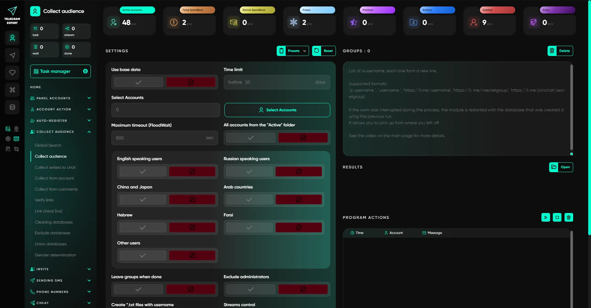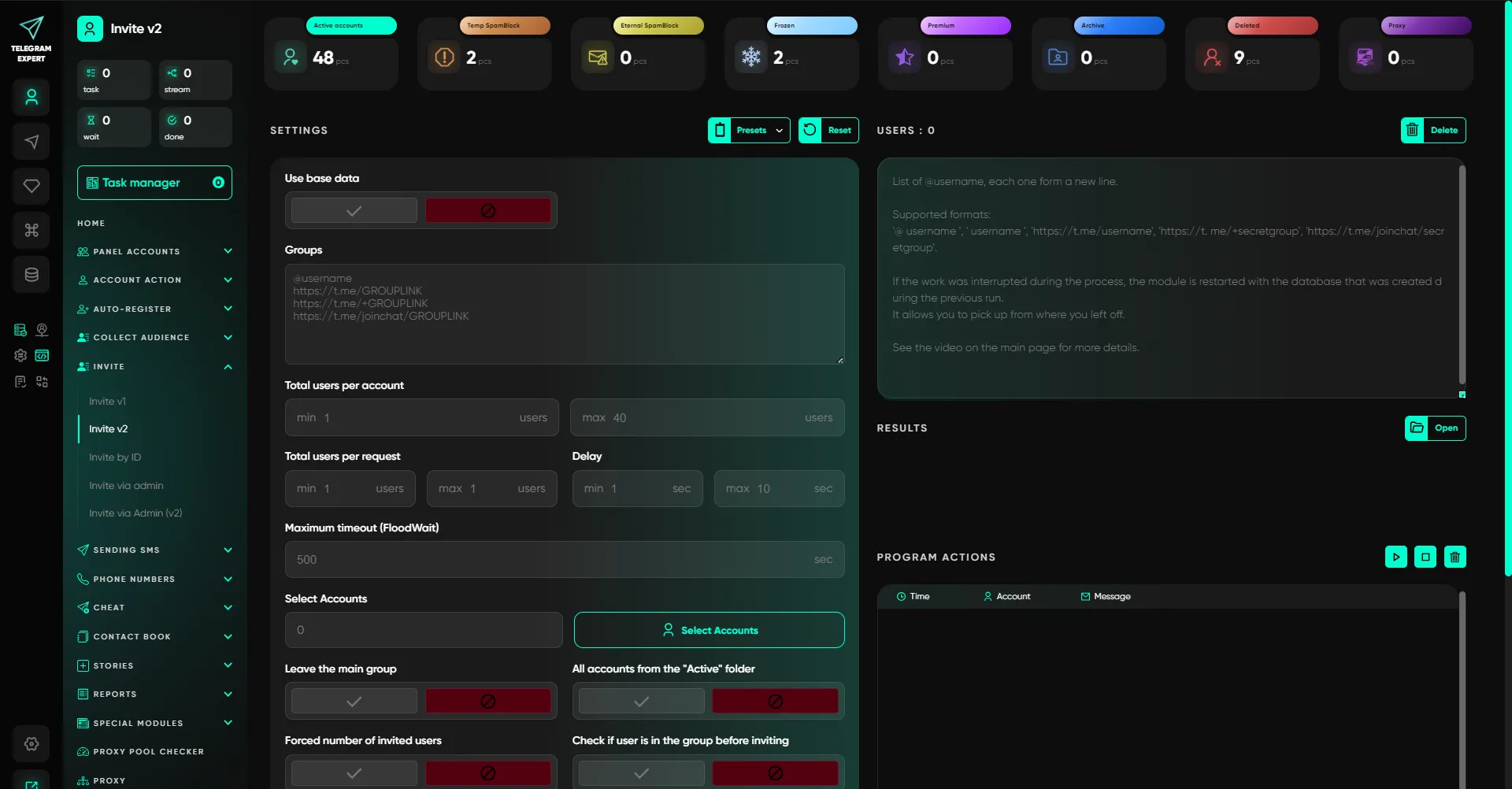 Moduły do tworzenia docelowych baz pod konkretne zadania: parsowanie z czatów/komentarzy, wybór aktywnych użytkowników, sprawdzanie linków i dalsza praca z bazami. Dzięki temu możesz budować wysyłki i zaproszenia w oparciu o realną grupę docelową, a nie na ślepo.